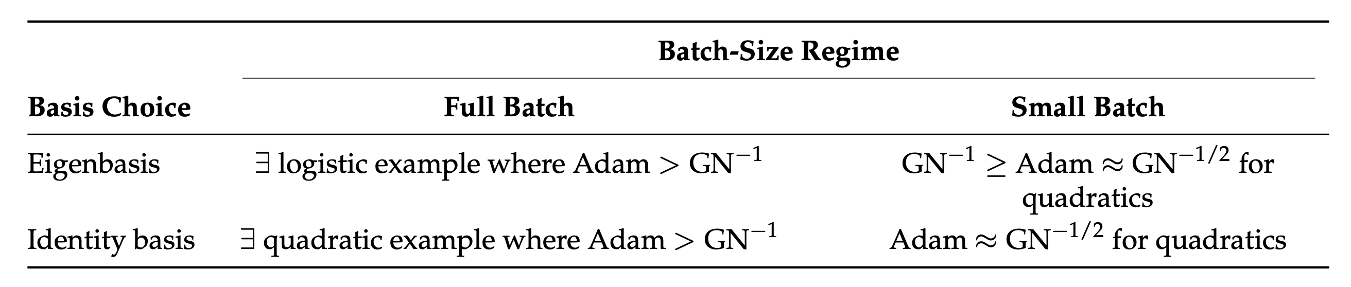 Adam or Gauss-Newton? A Comparative Study In Terms of Basis Alignment and SGD Noise